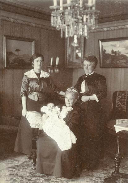 Till vänster sittandes Hanna Parrow gift Thernström, stående svärdottern Amelie Johansson gift Thernström och sondottern Elin Thernström gift Gullberg, i knät Adrienne Gullberg gift Strandh.